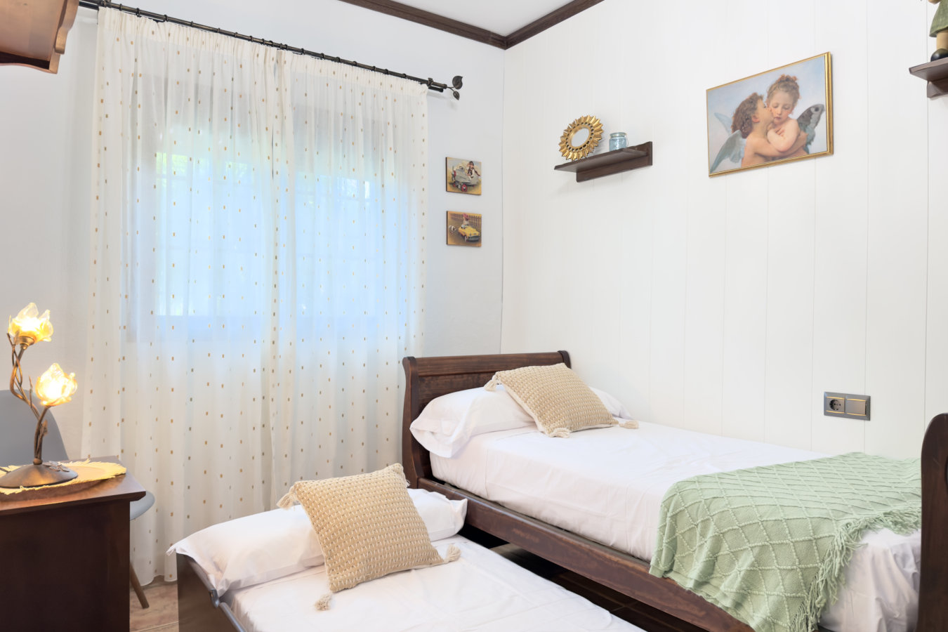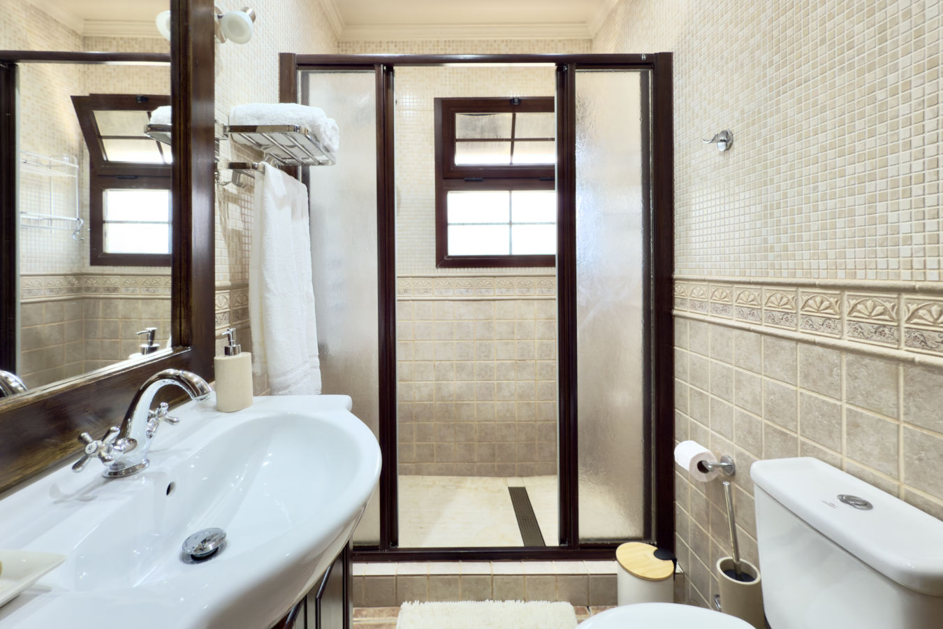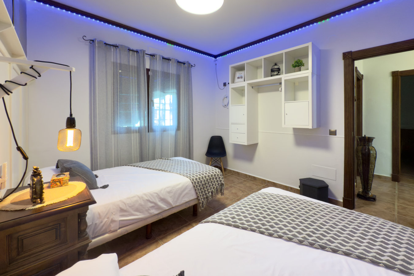 Las habitaciones se distribuyen a lo largo de un pasillo con aire acondicionado y ventiladores en cada dormitorio, garantizando una temperatura agradable durante todo el año. La habitación principal dispone de una cama de matrimonio y baño privado con ducha, mientras que las otras dos habitaciones tienen dos camas individuales cada una. Al final del pasillo se encuentra el baño principal, equipado con una bañera de hidromasaje ideal para relajarse. El alojamiento también incluye WiFi gratuito, ideal para quienes deseen mantenerse conectados durante su estancia, ya sea para ocio o trabajo remoto.