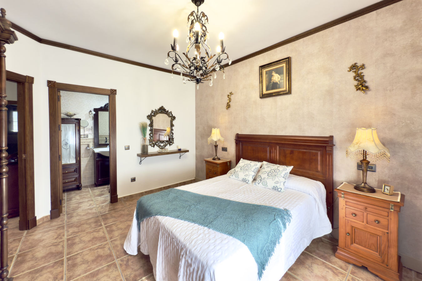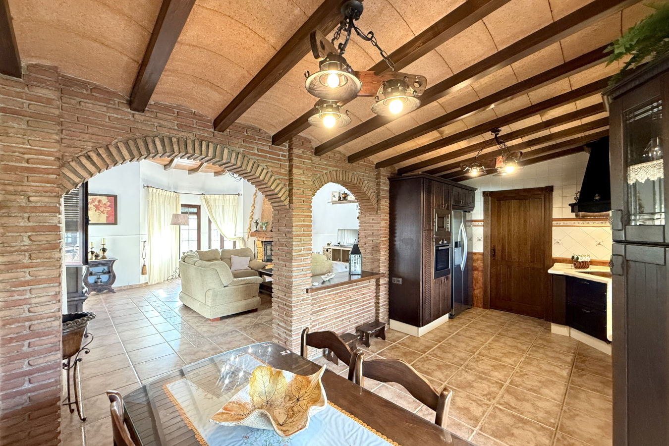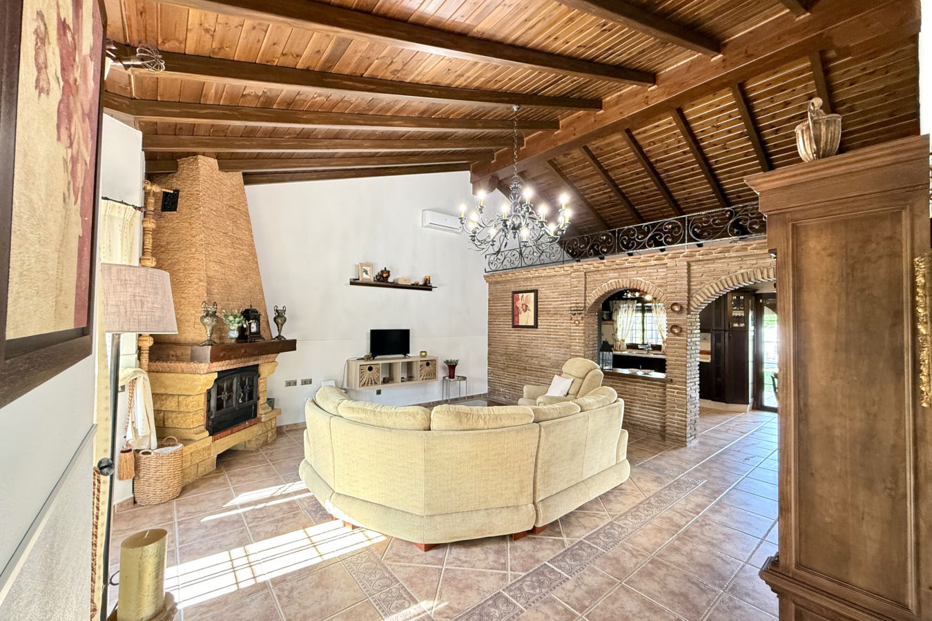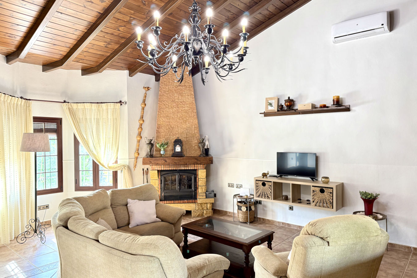 Esta espaciosa finca cuenta con 3 habitaciones y capacidad para hasta 6 personas. El amplio salón, con aire acondicionado, chimenea y techos altos con vigas de madera, se conecta de forma abierta con una cocina completamente equipada. Desde la cocina se accede directamente al porche exterior, donde encontrarás una zona de comedor al aire libre, barbacoa y acceso a la piscina privada, actualmente en construcción y disponible a partir del 1 de junio.